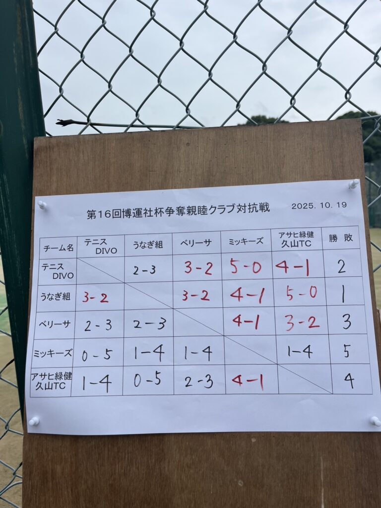 第16回博運社杯イベント 2025.10.202025年10月19日にアサヒ緑健久山テニス俱楽部にて開催されました。主 催 Tプランニング:代表 田島幹夫共 催 ㈱正木企画・アサヒ緑健久山テニス俱楽部今年は気温も良く雨も降らず、無事に開催する事が出来ました。協 賛 ㈱博運社・アサヒ緑健㈱・柳川屋・ダンロップスポーツマーケティング・ 久山カントリー㈱久山カントリー俱楽部・㈱トアルソン集合写真久山TCの監督監督の笑顔チーム紹介今年の優勝チームはうなぎ組でした。おめでとうございます。
